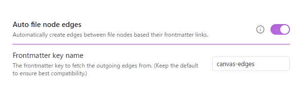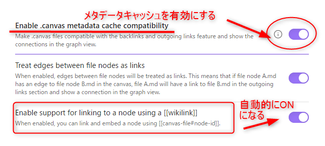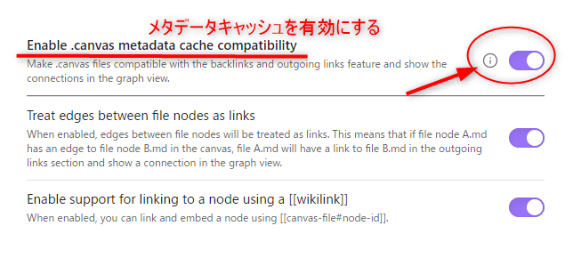 一つ前の項目で紹介した「Enable .canvas metadate cache compatibility」(メタデータキャッシュを有効にする)をONにすると、