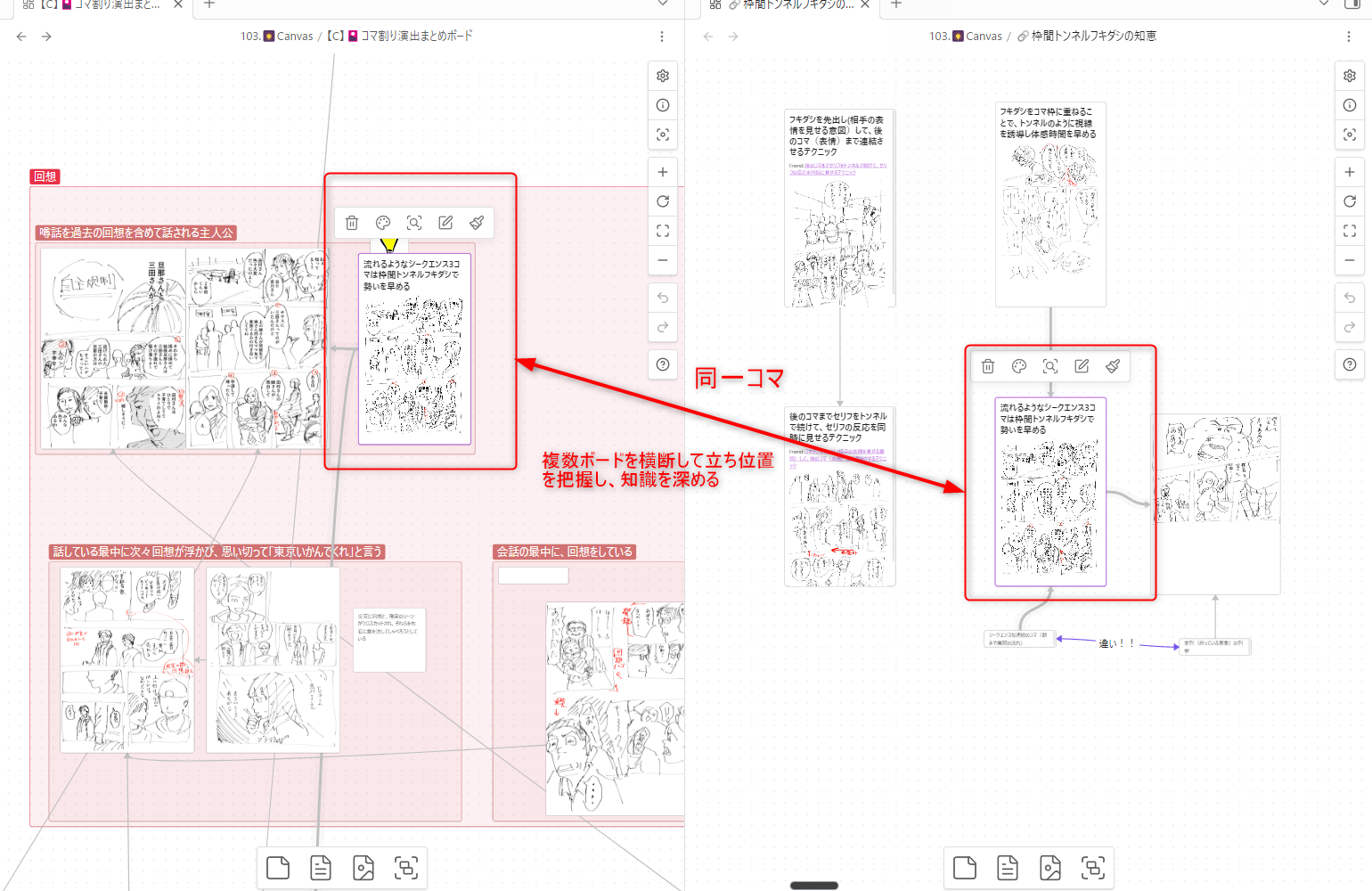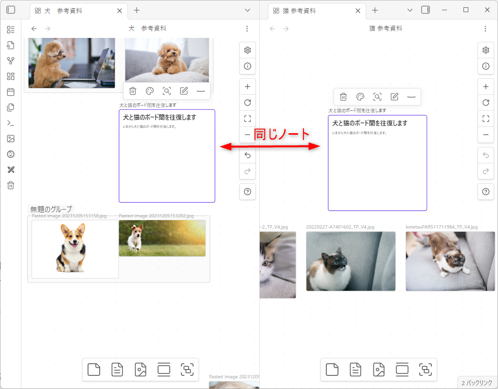 仮に、下記のように、二つのCanvasボードに同一のノートファイルを張り付けたとしましょう。