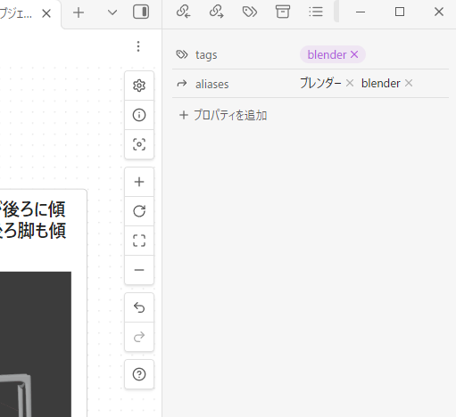 以下はプロパティ追加による事例の紹介です。canvasにプロパティを追加することで、aliases(エイリアス)やタグをつける事ができるので、検索でタグ検索やエイリアスによる別名検索ができるようになります。