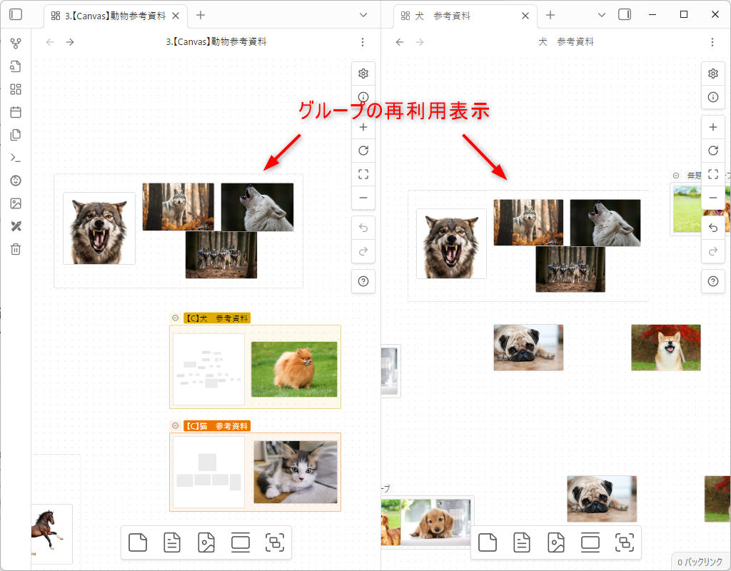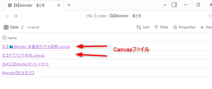 つまり、プロパティに関係性を記述しておけば、ふと思い立って、そのノートファイル同士を同一のCanvasに意図せず並べたときに、