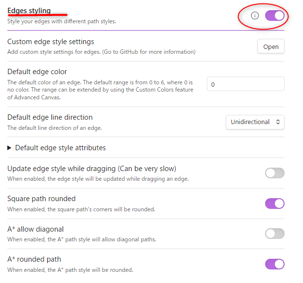 「Edges styling」をONにしてください。エッジのスタイルもcssの知識があれば自分で追加することが可能です。デフォルトのエッジスタイルも変更できます(Default edge style attributes)。またその細かな設定も追加可能です。